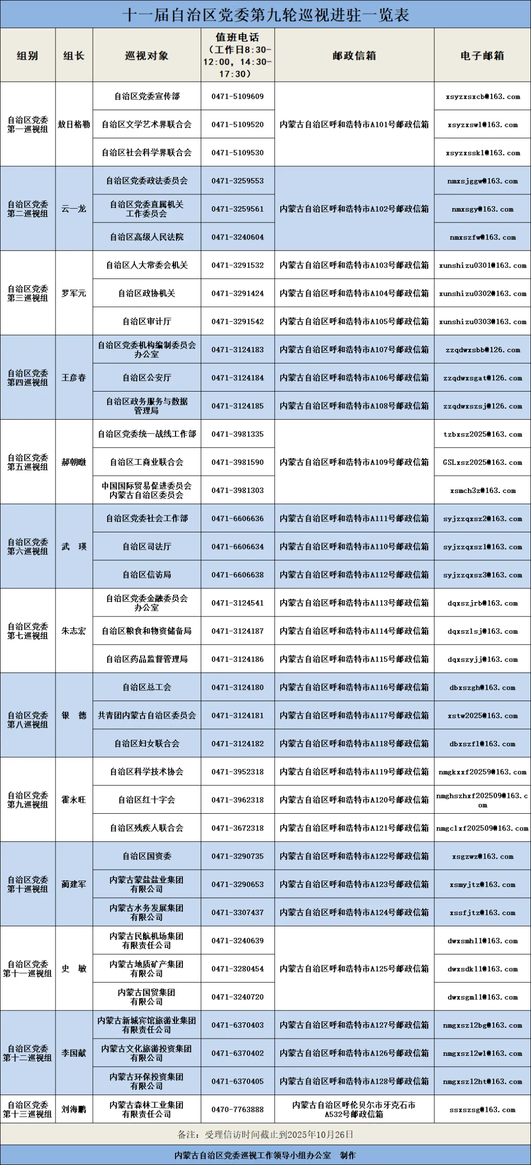 据悉,各巡视组将在被巡视单位工作50天左右,巡视期间设立专门值班电话和邮政信箱,主要受理反映被巡视党组织领导班子及其成员、下一级党组织主要负责人和重点岗位人员问题的来信来电,重点是关于违反政治纪律、组织纪律、廉洁纪律、群众纪律、工作纪律、生活纪律等方面的举报和反映。巡视组受理信访时间截止到2025年10月26日。